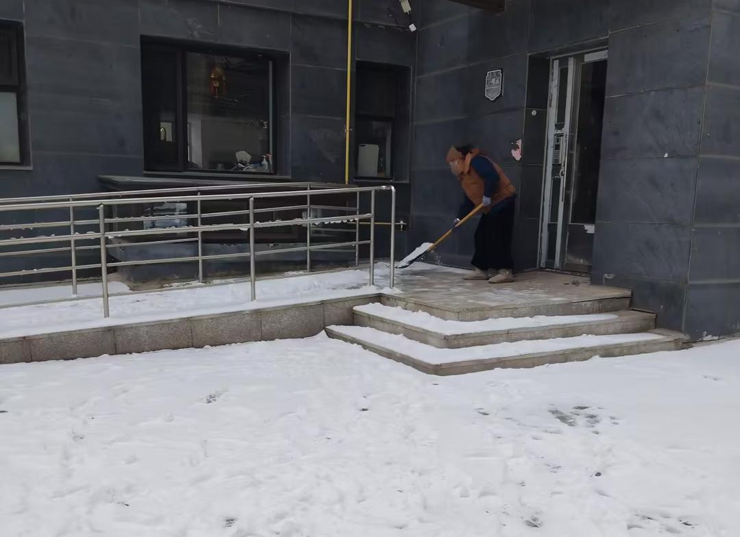 清晨,保洁到岗后第一时间清理单元门前积雪,为业主出行清理第一通道。铺设防滑地垫,清理人行步道,雪清后及时收起,清理地面,保障大堂整洁,她们忙的不亦乐乎。