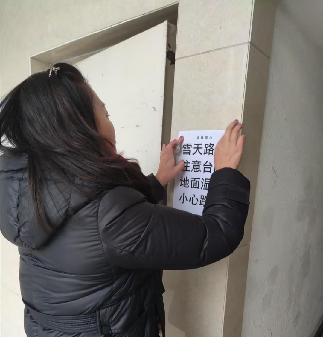 值岗人员提醒每位业主出行小心地滑,注意安全。物管人员到岗后第一时间全员出动,粘贴通知,提醒业主雪天路滑,小心脚下,让每一位业主在雪天里,依然能感受到温馨与安心。