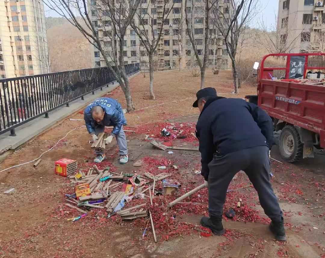 针对假期产生的大量生活垃圾、废弃装饰纸箱、临时堆放的杂物,以及居民家门口的废弃年桔、春联等,物业合理调配人力与清运资源,实行“日产日清、随产随清”的作业机制。安管人员协助引导居民规范投放节日垃圾,保洁团队对公共区域进行逐片清扫,工程人员同步对景观灯、装饰设施进行检查维护,拆除临时布置并做好收纳,为后续园区环境复原做好准备。